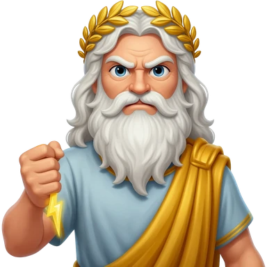 Zeus, whole body, white clothes, long white hair, lightnings, determined face emoji