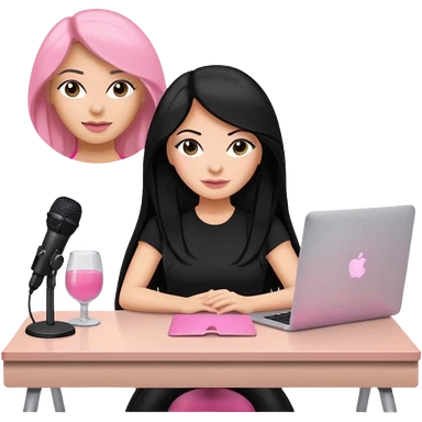 tanned long black hair woman, sat at desk with pink MacBook, podcast microphone black top and pink, sexy, glass table emoji