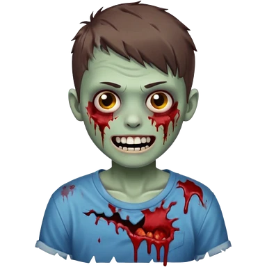 zombie boy with brown short spiky hair, white skin, and white eyes; an open smile, and bloodied teeth; emoji