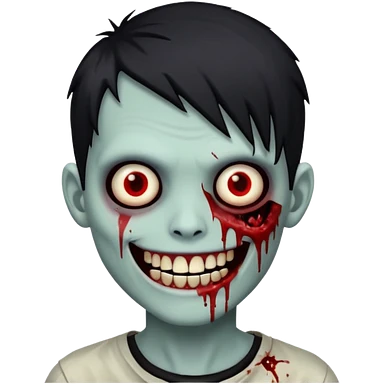 zombie boy with emo hair, white skin, and white eyes; an open smile, and bloodied teeth; emoji