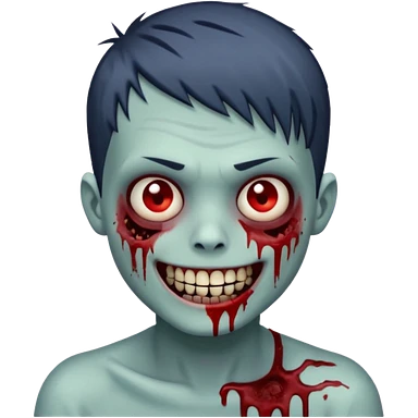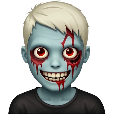 zombie boy with emo short hair, white skin, and white eyes; an open smile, and bloodied teeth; emoji