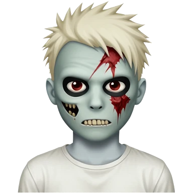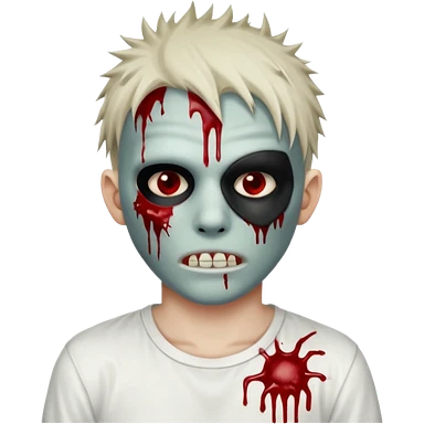 zombie boy with emo short hair, white skin, and white eyes; an open smile, and bloodied teeth; emoji