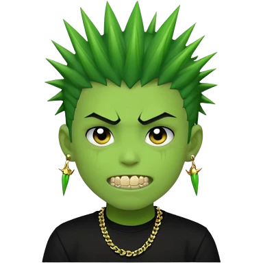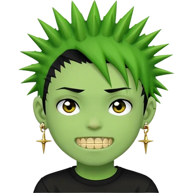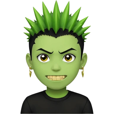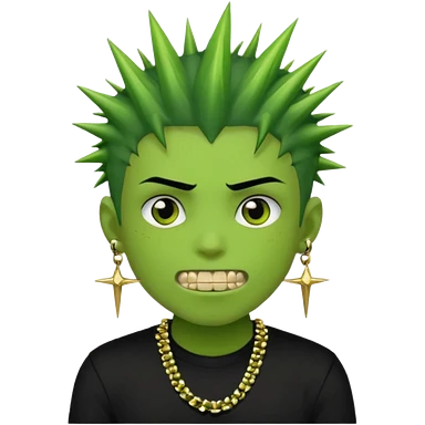 green zombie boy with spiky black emo hair and a black shirt with piercings and gold grilzz emoji