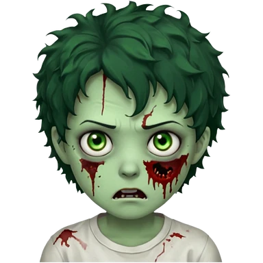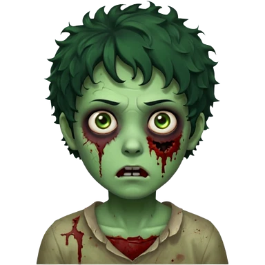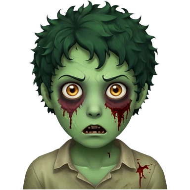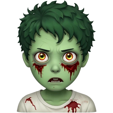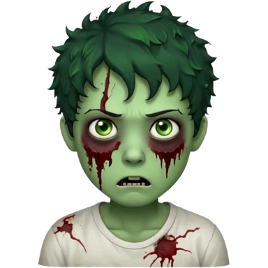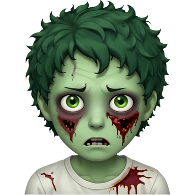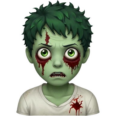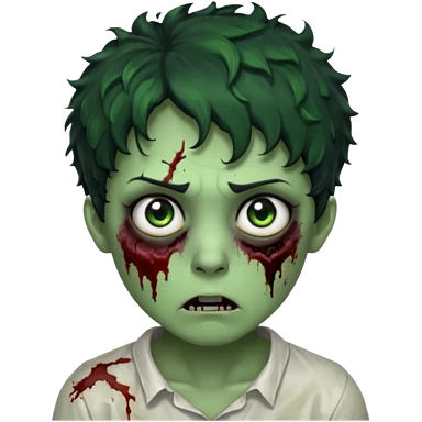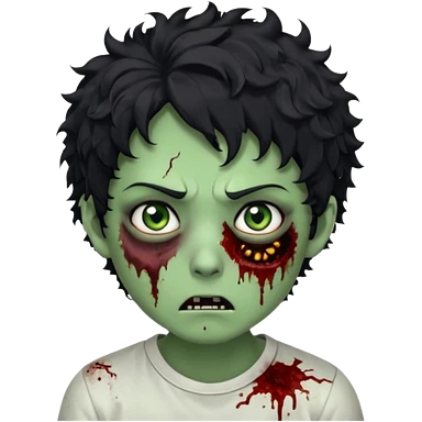 zombie character with green skin, messy short curly black hair, and no glasses. Give him large expressive eyes, a slightly frightened or eerie expression, subtle wounds, dark under-eye shadows, and a few cracks or dried blood marks on the face. white shirt and without bleeding eyes **BLACK HAIR**emoji