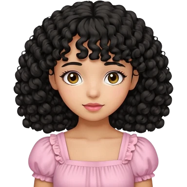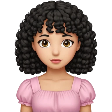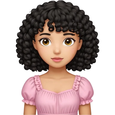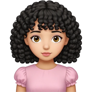 uma menina fofa de pele oliva e cabelos pretos encaracolados e com franja encaracolada e um vestido rosa pastel emoji