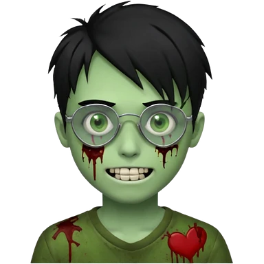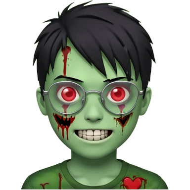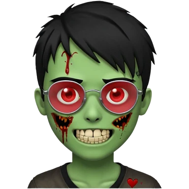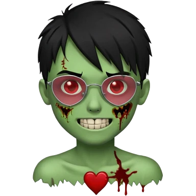 Zombie emo boy, green skin and black hair, chrome heart glasses and a scary cut open smile, scars and blood under eyes emoji | AI Emoji Generator