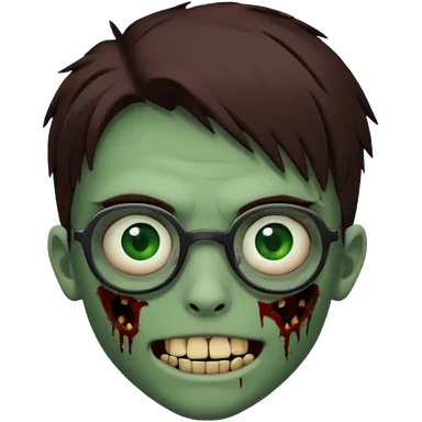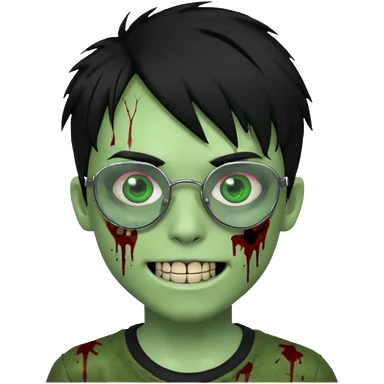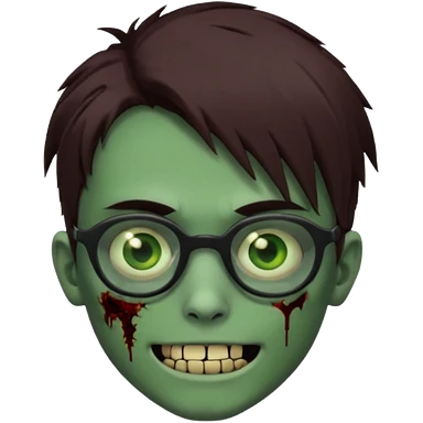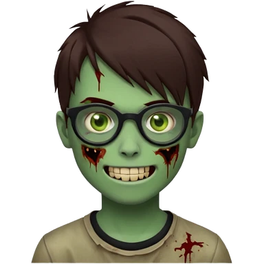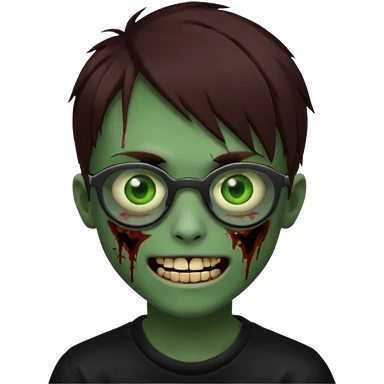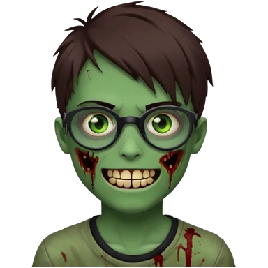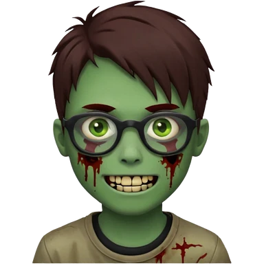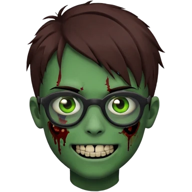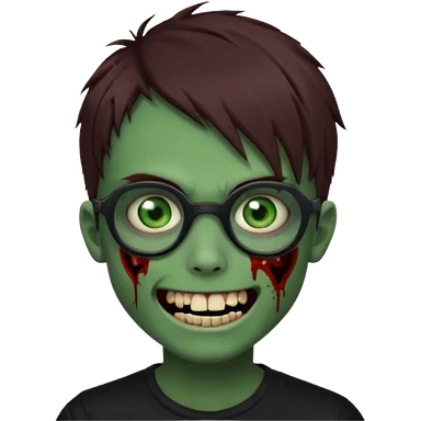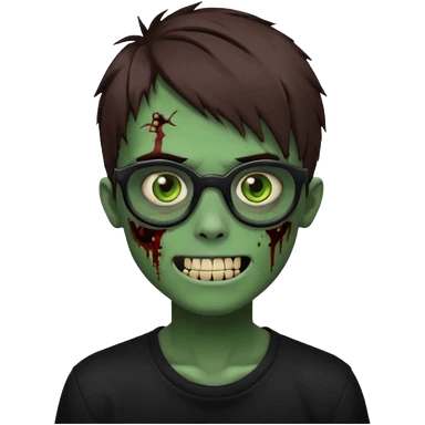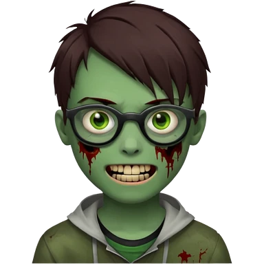 Zombie emo boy, green skin and brown hair, black glasses and a scary smile, scars and blood under eyes emoji