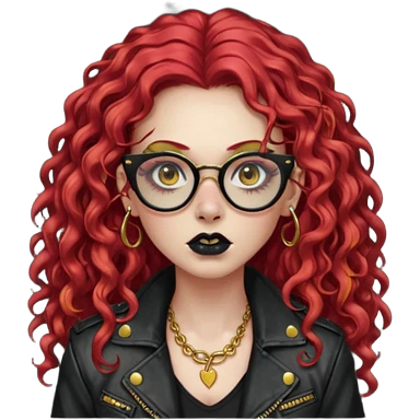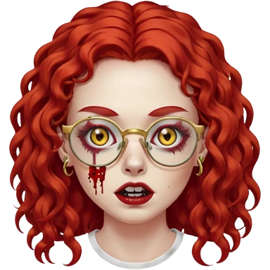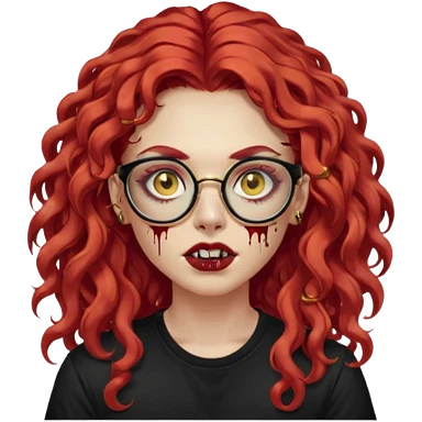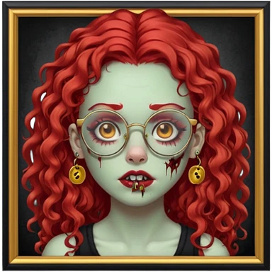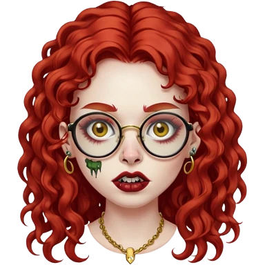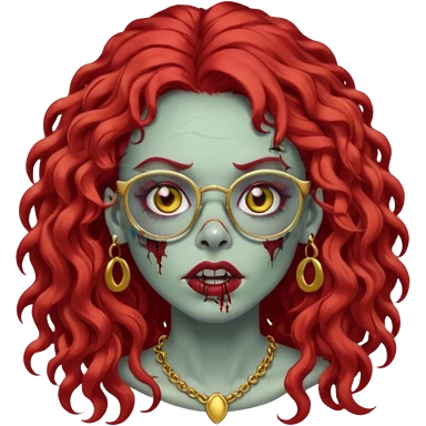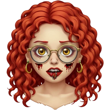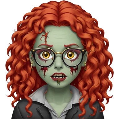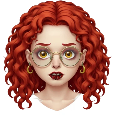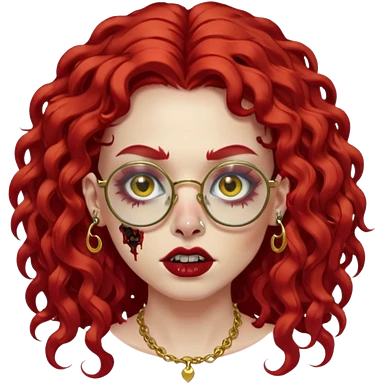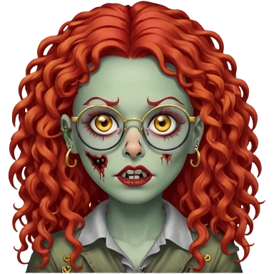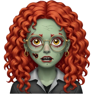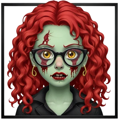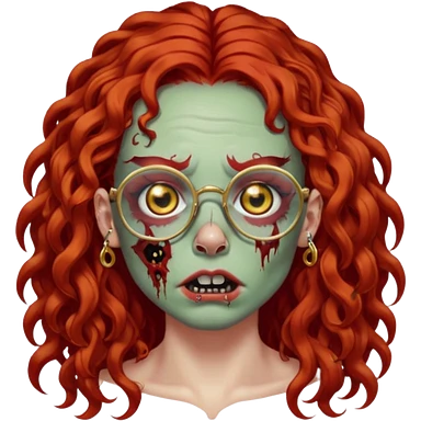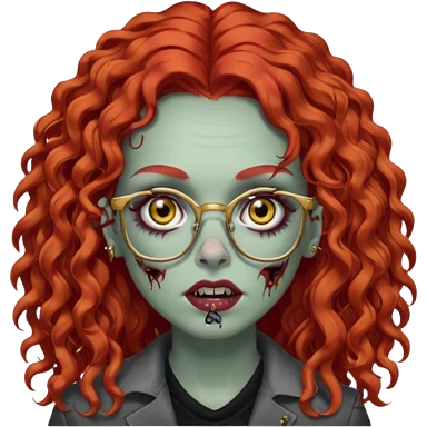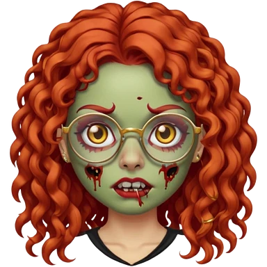 zombie girl emoji with long red curly hair, thick lashes, black glasses, gold nose piercings on each nostril, and a gold eyebrow piercing. emoji | AI Emoji Generator
