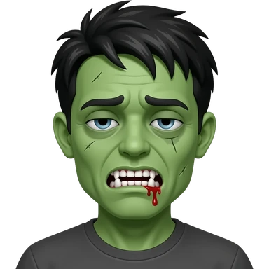 Zombie green skin dead, Black long Hair hanging over one eye, white teeth with blood leaking out, minor scar under eye, drowsy eyes, hazel color eyes, black collared shirt, gorey crazy, low eyes, dirty skin, one eyes gone the other eye drowsy emoji | AI Emoji Generator