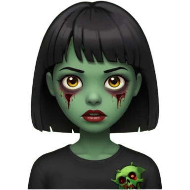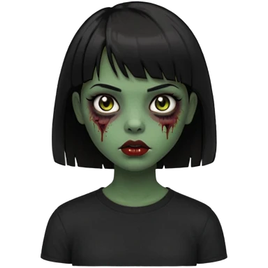 Zombie girl emoji verde escuro com cabelo curto liso preto no ombro e franja na altura da sobrancelha com uma blusa preta emoji