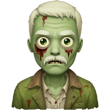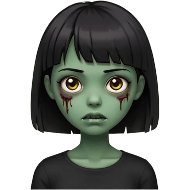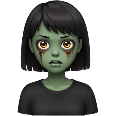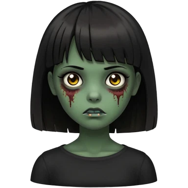 Zombie girl emoji verde escuro com cabelo curto liso preto no ombro e franja na altura da sobrancelha cobrindo completamente a testa, usando uma blusa preta, com olhos castanhos escuros emoji