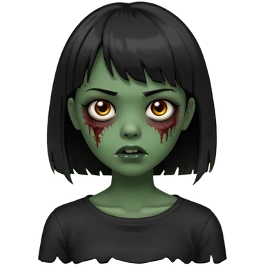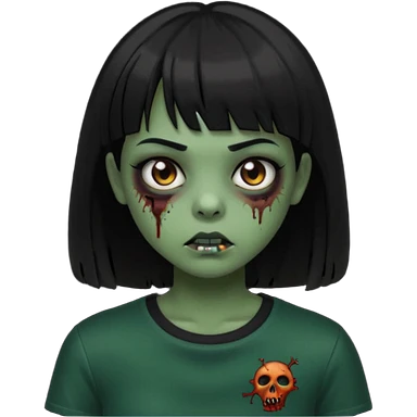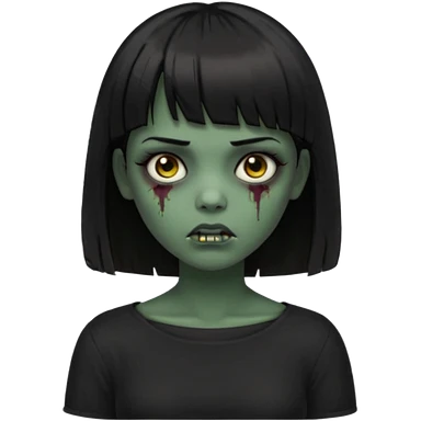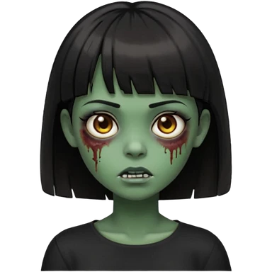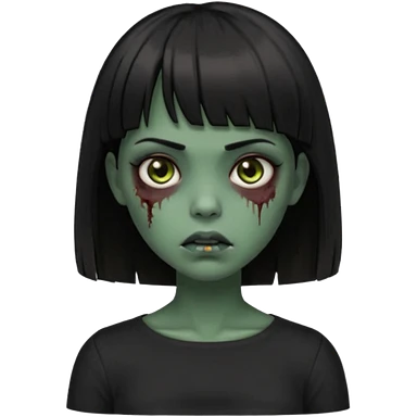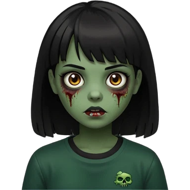 Zombie girl emoji verde escuro com cabelo curto liso preto no ombro e franja na altura da sobrancelha cobrindo completamente a testa, com uma blusa preta, olhos castanhos escuros emoji