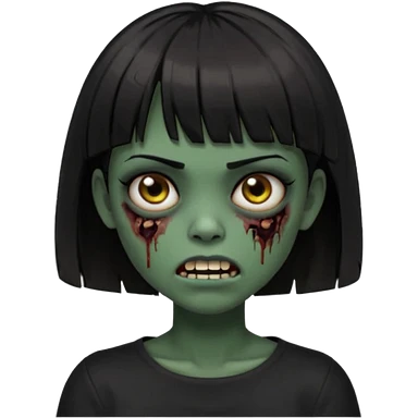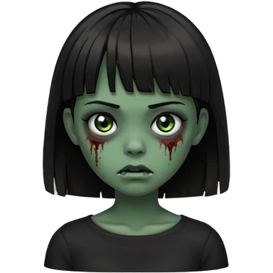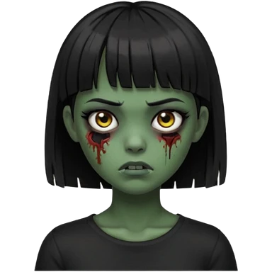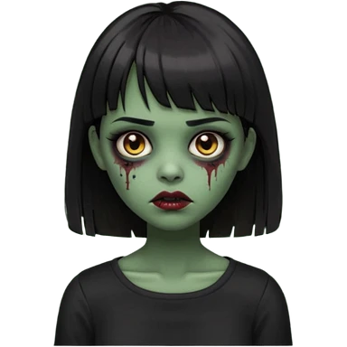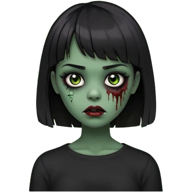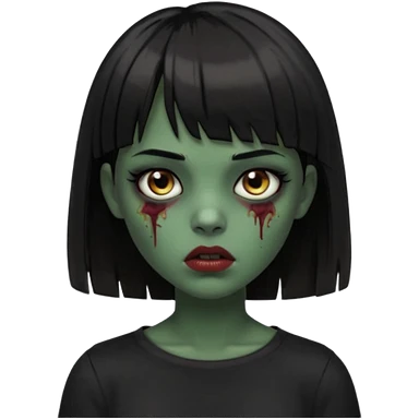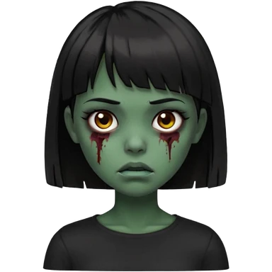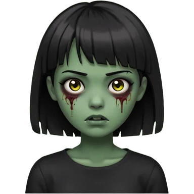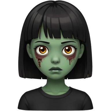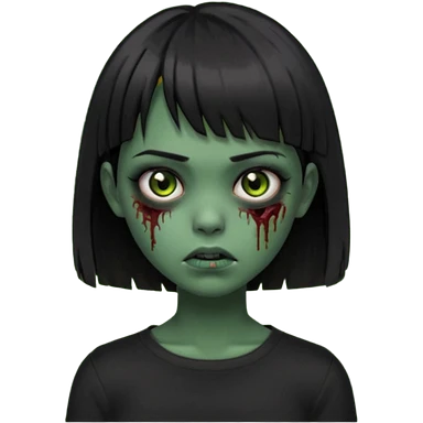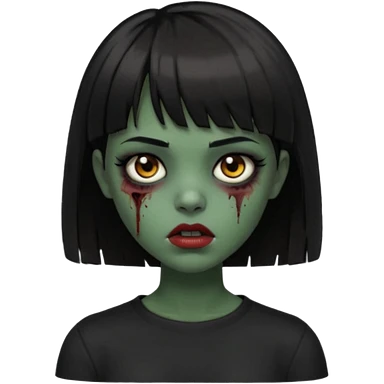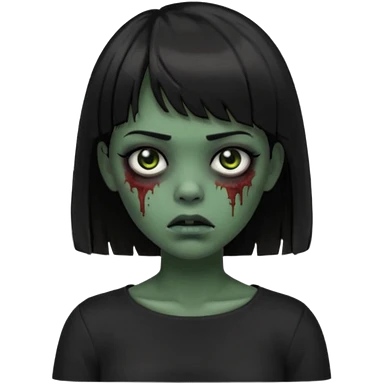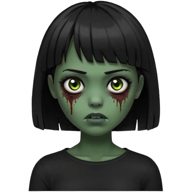 Zombie girl emoji verde escuro com cabelo curto liso preto no ombro e franja na altura da sobrancelha cobrindo completamente a testa, com uma blusa preta, olhos castanhos escuros emoji