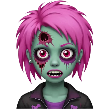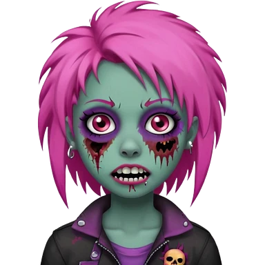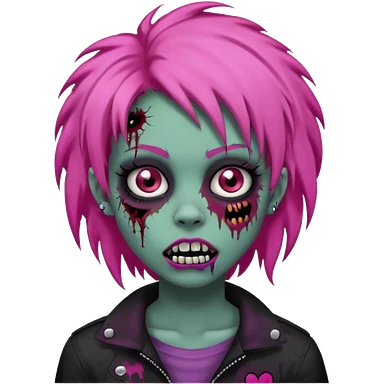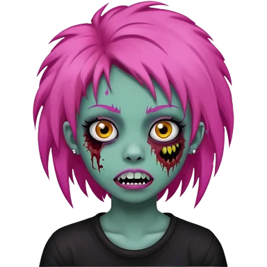 girl, zombie, pink coily hair, medium long, emo, shaggy, dark, spooky, piercing on eyebrow, colourful teeth, creepy blank expression emoji