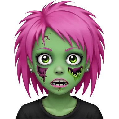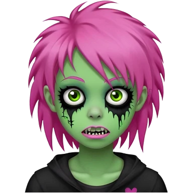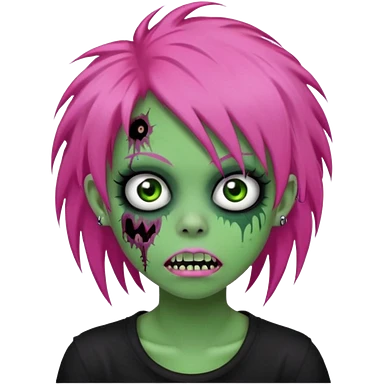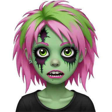 girl, green zombie, pink coily hair, medium long, emo, shaggy, dark, spooky, piercing on eyebrow, colourful teeth, creepy blank expression emoji