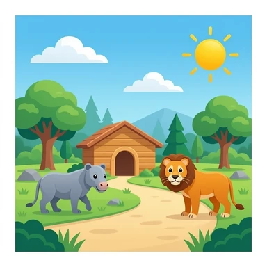 rustic wooden zoo gate with 'zoo' sign, surrounded by an elephant, lion, kangaroo, and monkey, traditional emoji style, not AI art emoji