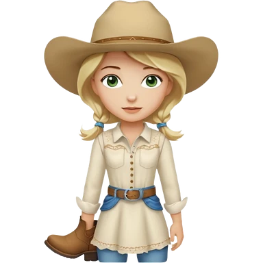 cowgirl bionda con occhi verdi/azzurri con un vestito bianco stivali e cappello beige emoji