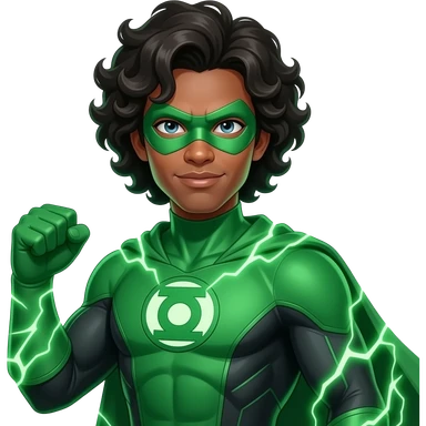 A brown guy with shoulder length curly black hair as a superhero with a green costume about green electricity and has a cool mask without covering his hair and mouth emoji