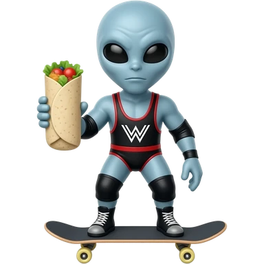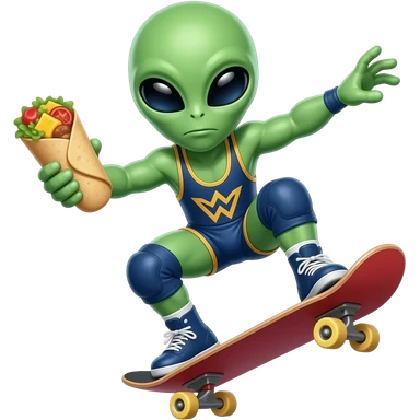 An alien on a skateboard doing a trick while holding a breakfast burrito while wearing a wrestling singlet emoji