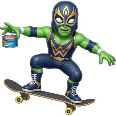 An alien on a skateboard doing a trick while holding a tuna can while wearing the wrestler macho man’s outfit while still being an alien emoji