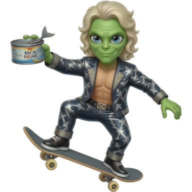 An alien on a skateboard doing a trick while holding a tuna can while wearing a the wrestler Rick flairs iconic costume emoji