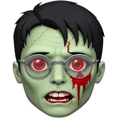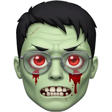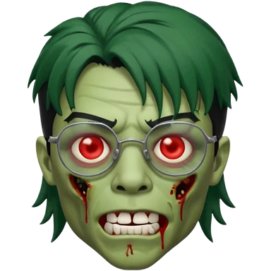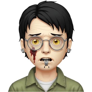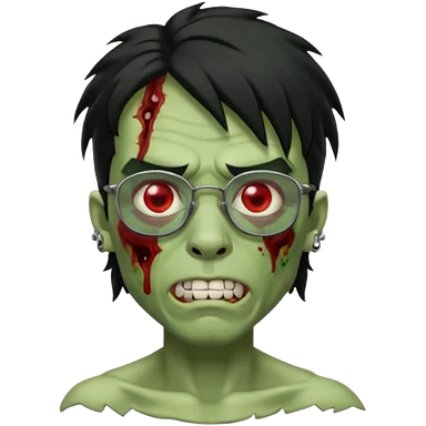 homem zumbi de óculos cabelo preto com muita olheira deixar pele dele verde dentes brancos e olhos vermelhos e ensanguentados deixar óculos quadrado e preto e olhos cheio de veias vermelhas e encher o rosto de piercings colocar piercing em todo rosto emoji
