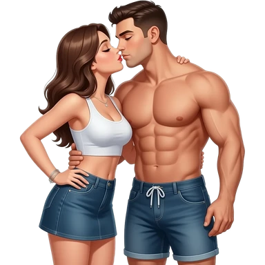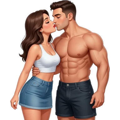 Çok Çok kısa kumaştan etek ve crop giyip kaslı üstü olmayan altında şort olanbir adamı öpen kadın emoji