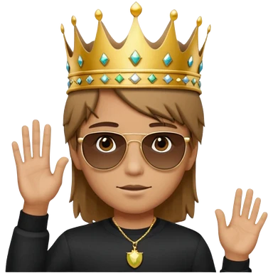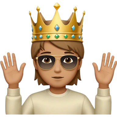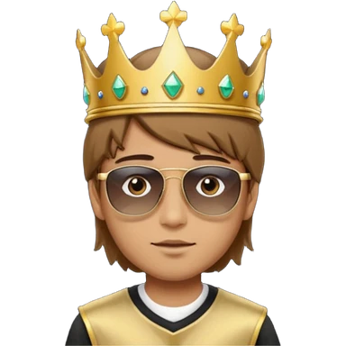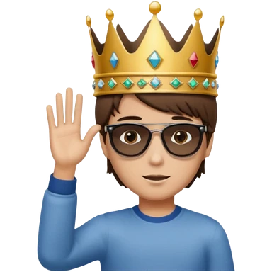 Un niño con cabello lacio no muy largo color marrón castaño,ojos marrones,piel no muy blanca, que tenga lentes de sol color negro,reloj en la mano derecha y una corona como sombrero emoji