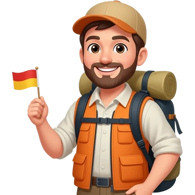 A smiling male travel guide in hiking outfit, orange vest, backpack, cap, holding a small flag, happy expression, adventure theme, Apple emoji style, 3D cartoon, simple background emoji