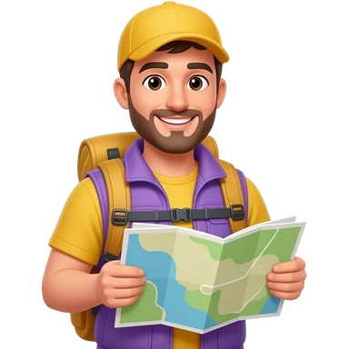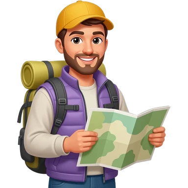 A smiling male travel guide in hiking clothes, wearing a lilac vest and yellow cap, backpack, holding an unfolded map in both hands, happy expression, adventure theme, portrait style, close-up, upper body, Apple emoji style, 3D cartoon, simple background, predominantly lilac and yellow colors emoji