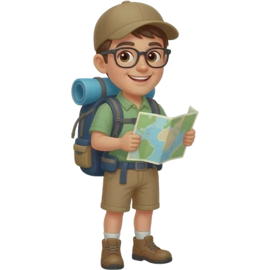 Smiling travel guide with backpack, cap, holding a map, hiking outfit, happy, Apple emoji style emoji