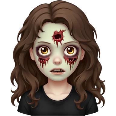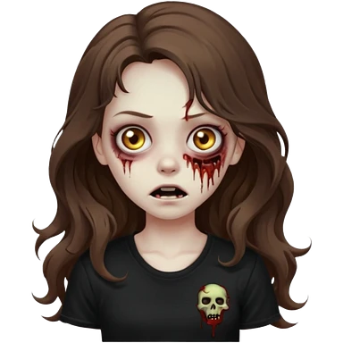 crie um emoji de uma garota zoombie cabelo castanho e longo , assustadora e fofa com cabelo ondulado 2b e camiseta básica preta emoji