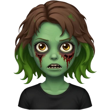 crie um emoji de uma garota zoombie pele verde e cabelo castanho, assustadora e fofa com cabelo ondulado 2b e camiseta básica preta emoji