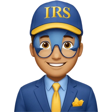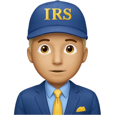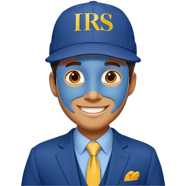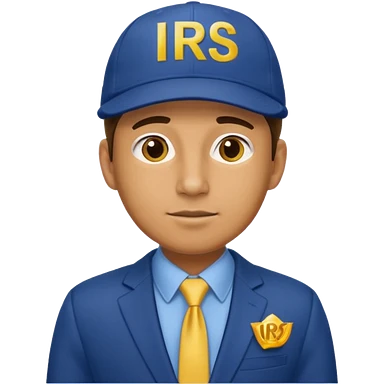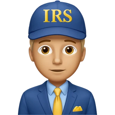 a man dressed in a blue suit with a cap on that says IRS in yellow letters emoji