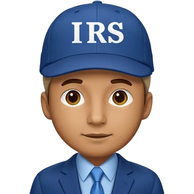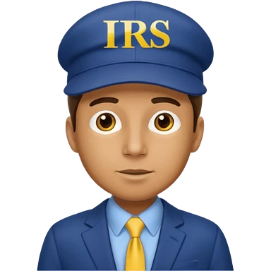 a man dressed in a blue suit with a cap on that says IRS emoji