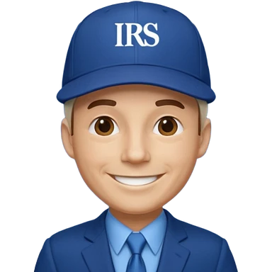 a man smiling dressed in a blue suit with a cap on that says IRS in yellow letters emoji