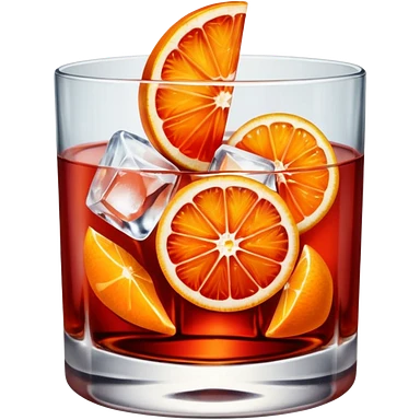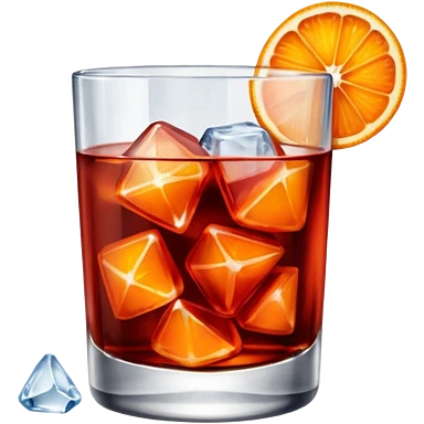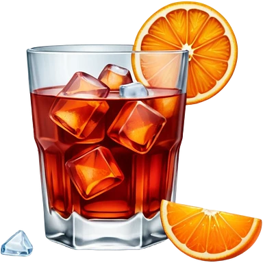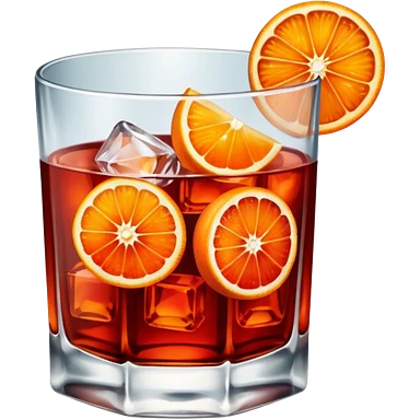 A short glass with bright red Negroni, ice cubes, and an orange wedge on top. emoji