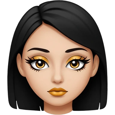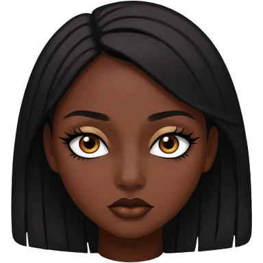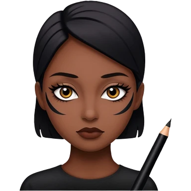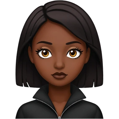 Photograph of a young woman with long, straight black hair and bangs, wearing a black turtleneck sweater. emoji