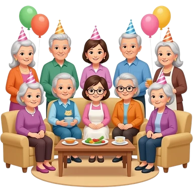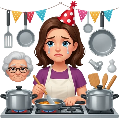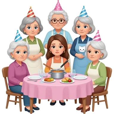 many old ladies comes of a kitty party and a young lady is tired of cooking for them emoji