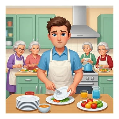 a tired young man doing dishes while many old ladies enjoy food in a kitty emoji