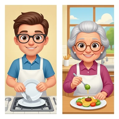 a young man doing dishes while old ladies enjoy food in a kitty emoji