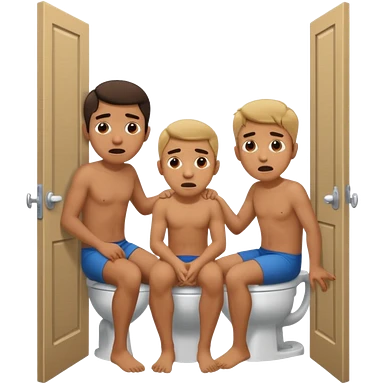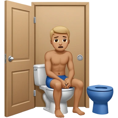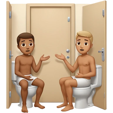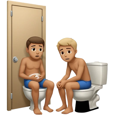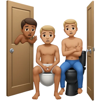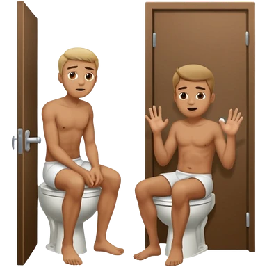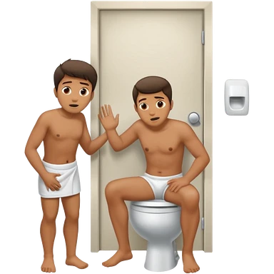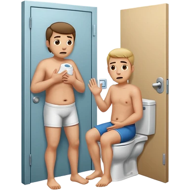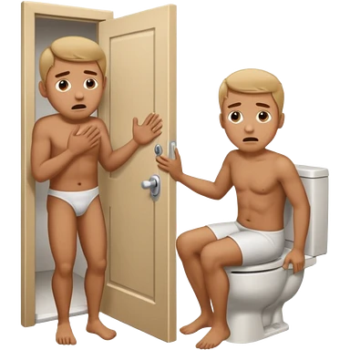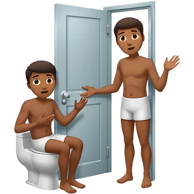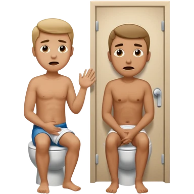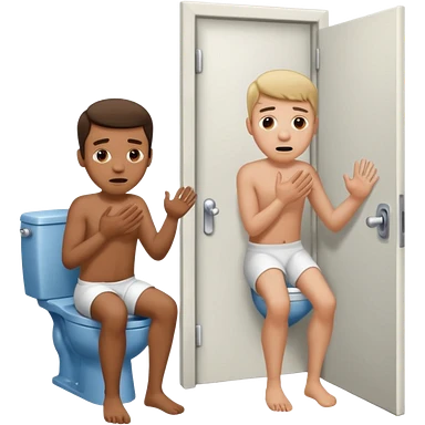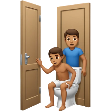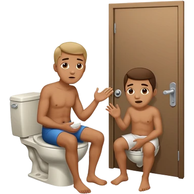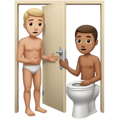 Man using the toilet while the other man is banging on the door begging holding it emoji