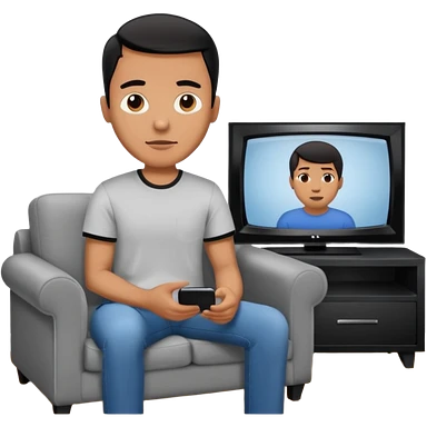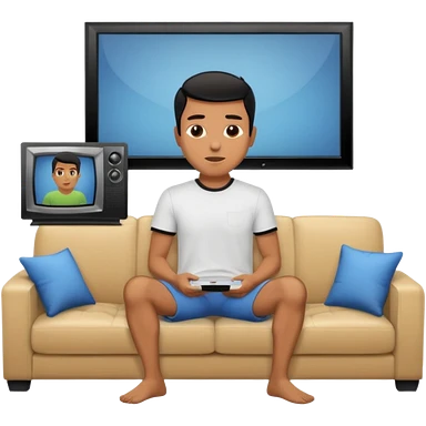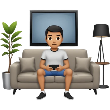 A man photographed from behind, sitting on a sofa and watching the news on TV on a modern flat screen. The setting is a living room. emoji