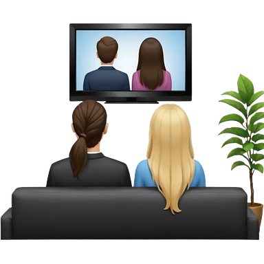 A man and a women long hir photographed from behind, sitting on a sofa and watching the news on TV on a modern flat screen. The setting is a living room. emoji