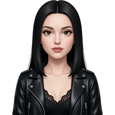 Beyaz tenli yani ten rengi çok açık olsunsiyah uzun düz saçlı hafif çekik gözlü kahverengi gözlü uzun kirpikli ince seyrek kaşlı üzerinde siyah dantelli kıyafet var üstünde deri ceket dudakları kalın büyük ve düz olsun soğuk tonlarda makyaj olsun yüzünde pürüzsüz bir cildi olsun emoji