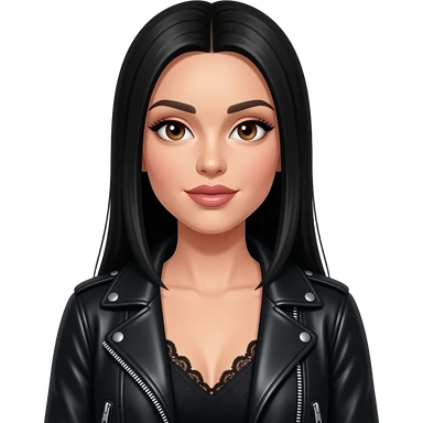 Beyaz tenli yani ten rengi çok açık olsunsiyah uzun düz saçlı hafif çekik gözlü kahverengi gözlü uzun kirpikli üzerinde siyah dantelli kıyafet var üstünde deri ceket dudakları kalın büyük soğuk tonlarda makyaj olsun yüzünde pürüzsüz bir cildi olsun emoji