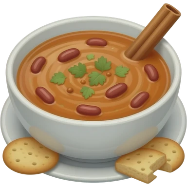 Genera una sopa espesa con el color rojo de las habichuelas, sin cambiar las galletas, la astilla de canela y el tazón de está imagen emoji