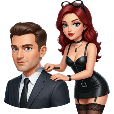 Cinematic photo of a dominant woman in leather standing over a submissive man in a moody, dimly lit room; dramatic shadows, sharp power dynamic, role reversal, 8k resolution emoji