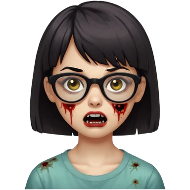 faça uma menina zumbi,com o cabelo curto,até o pescoço,franja,óculos pretos médios,olhos escuros,boca meio aberta e alguns machucados pelo rosto emoji