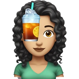 white girl with long black curly hair holding a brisk ice tea emoji